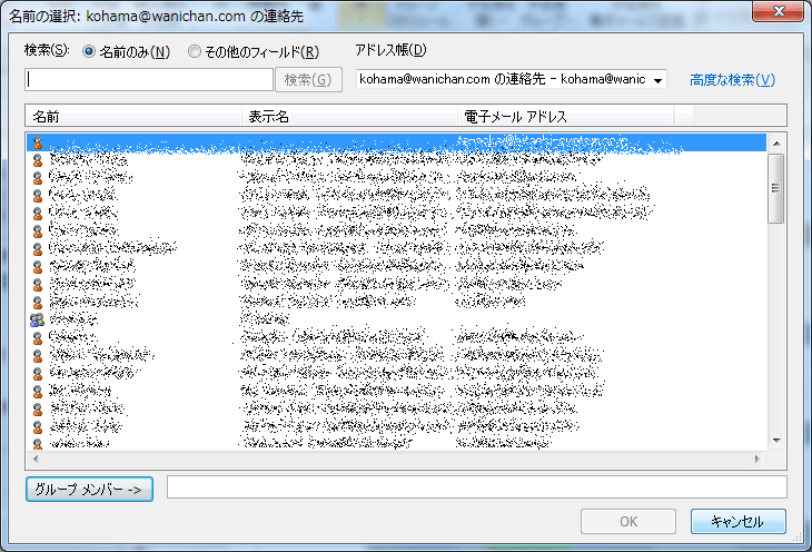 - Microsoft Exchangeサーバーの場合、連絡先からメンバーを選択できます。ただし、それ以外の環境の場合は[キャンセル]ボタンをクリックします。[キャンセル]ボタンをクリックすることで、空の予定表グループが生成されます。