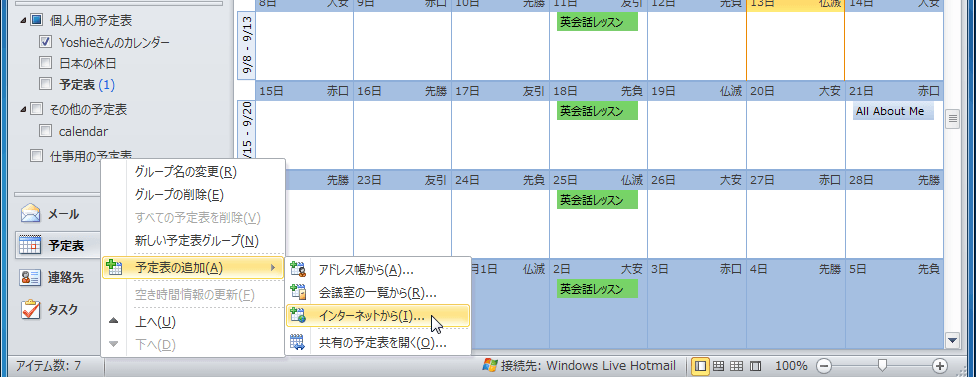 空の予定表グループに新しい予定表を追加するには、その予定表グループを右クリックして、ショートカットメニューより[予定表の追加]をポイントし、追加する予定表の場所を選択します。