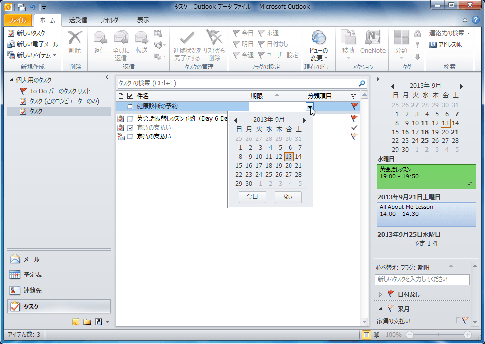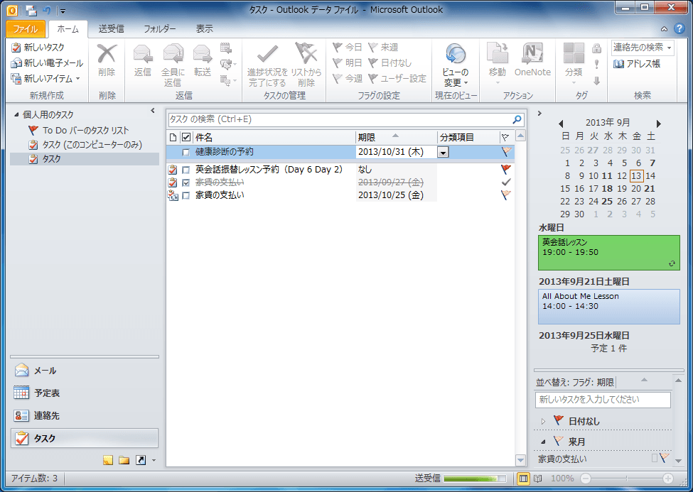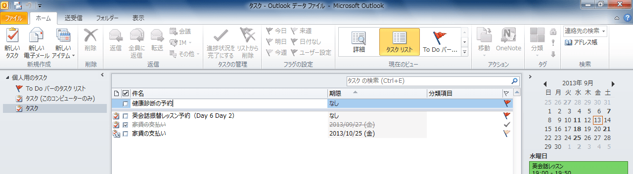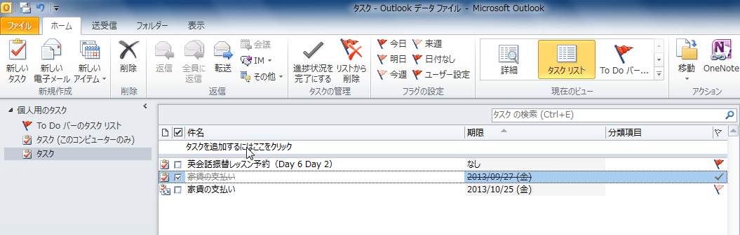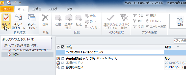 - [ホーム]タブの[新しいタスク]をクリックします。[ホーム]タブの[新しいタスク]をクリック