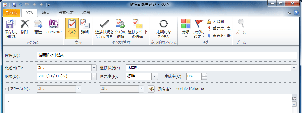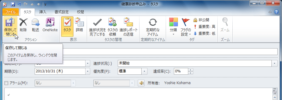 - [ホーム]タブを開き、[保存して閉じる]をクリックするとタスクが保存され、ウィンドウが閉じられます。
