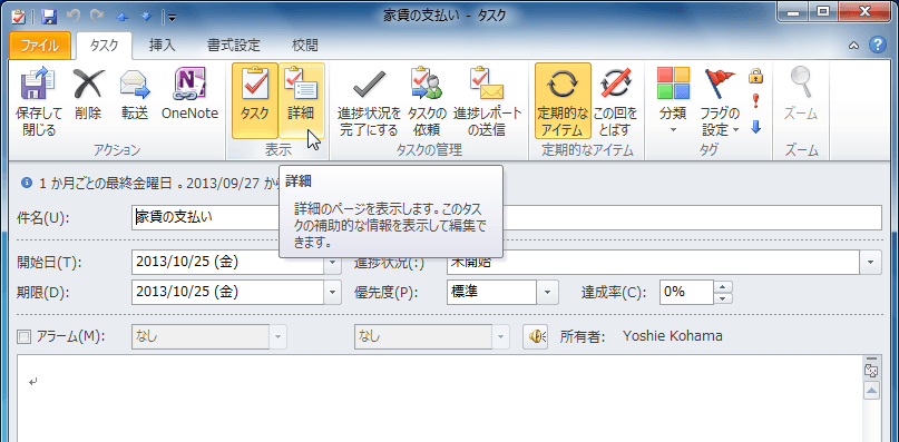 Outlook 2010でタスクの詳細のページを表示すると、そのタスクの補助的な情報を表示し編集することができます。タスクアイテムを開き、[タスク]タブの[表示]グループの[詳細]をクリックします。