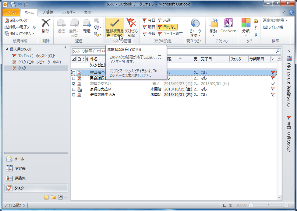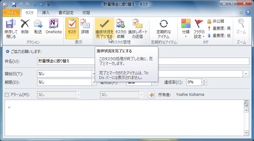 - [タスク]タブを開き、[タスクの管理]グループの[進捗状況を完了にする]にチェック付けます。