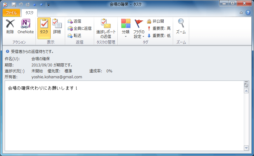 また、依頼済みのタスクアイテムを開くと、下の図のように「受信者からの返信待ちです。」と情報バーに表示されます。