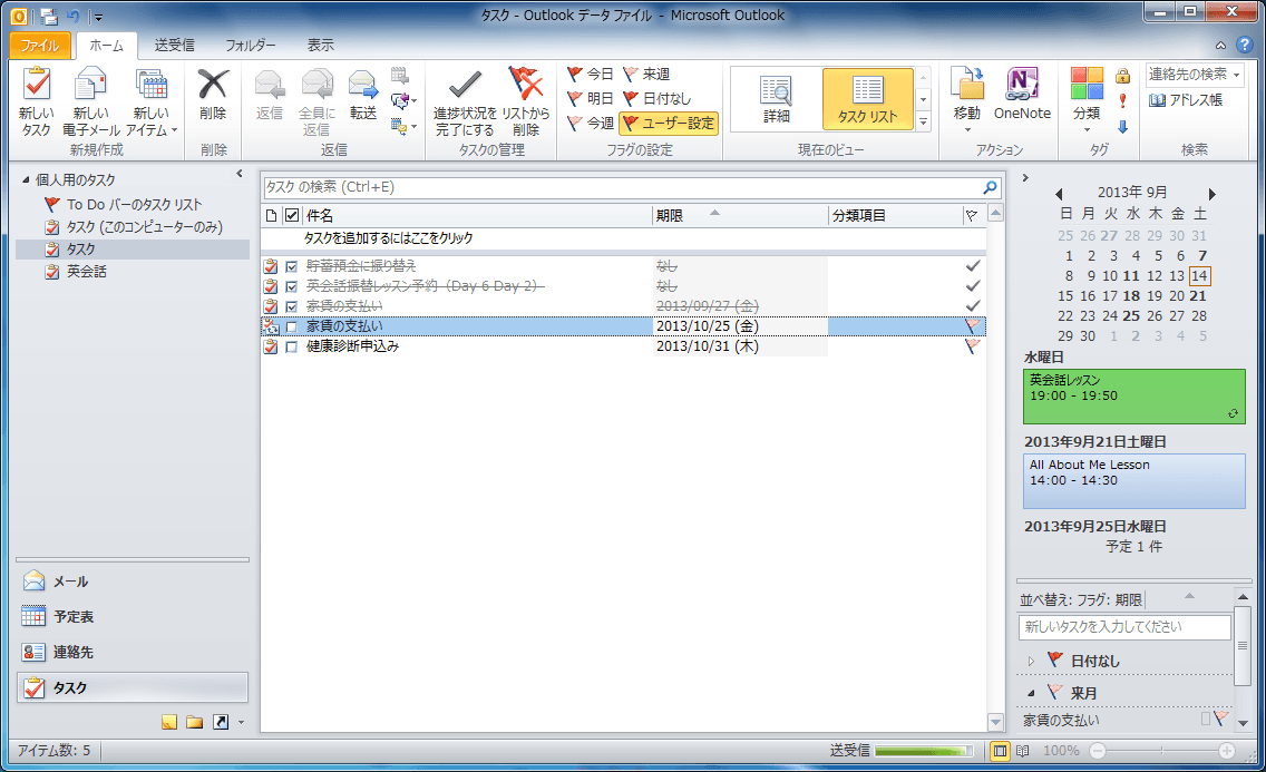 - [ホーム]タブの[タスクの管理]グループの[リストから削除]をクリックします。