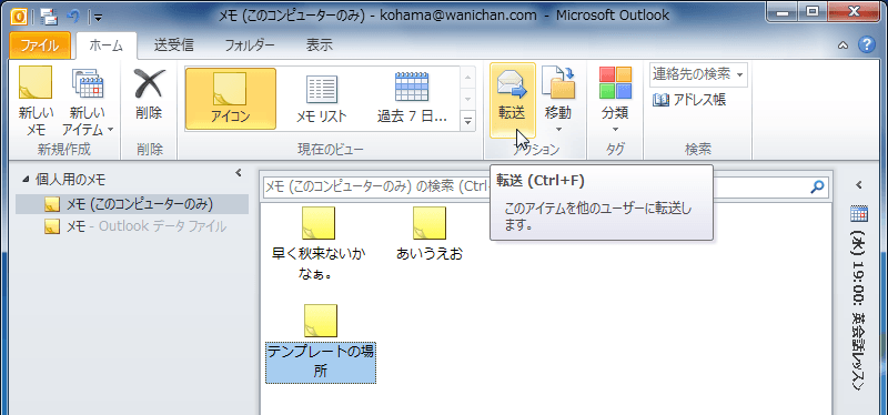 Outlook 2010でメモをほかの人に送りたい場合などにおいて、メモを転送することができます。転送したいメモを選択し、[ホーム]タブの[アクション]グループにある[転送]を選択するとそのメモアイテムが添付ファイルとして送信できます。
