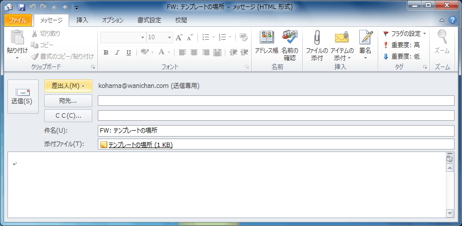 - メモアイテムが添付ファイルとして送信できる準備ができたので、宛先、件名などを入力して、[送信]ボタンをクリックします。