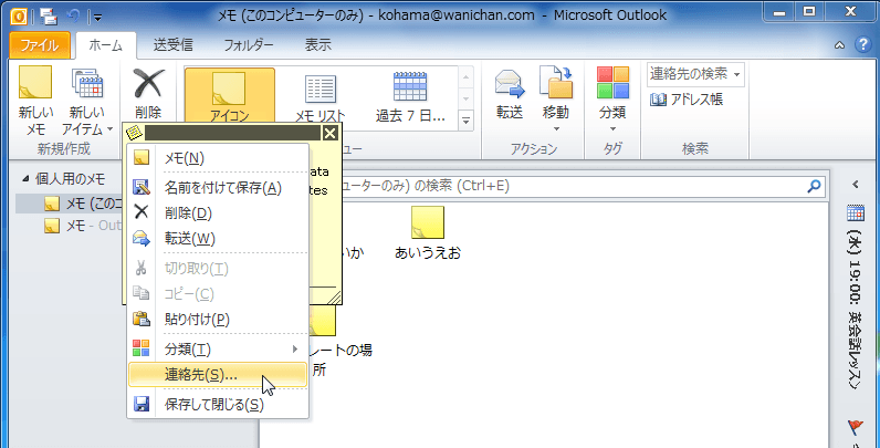 Outlook 2010で連絡先と関連付けたいメモを開き、左上のメモアイコンをクリックして[連絡先]を選択し、連絡先を指定します。