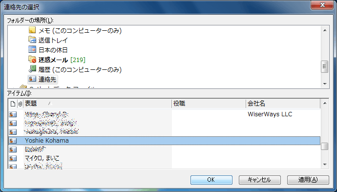 - 関連付けたい連絡先を選択して[OK]ボタンをクリックします。