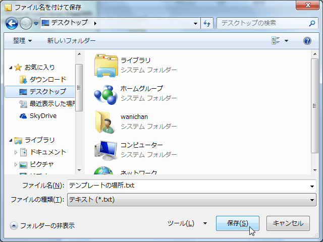 - [名前を付けて保存]ダイアログボックスの[ファイルの種類]ボックス一覧から[テキスト]を選択します。