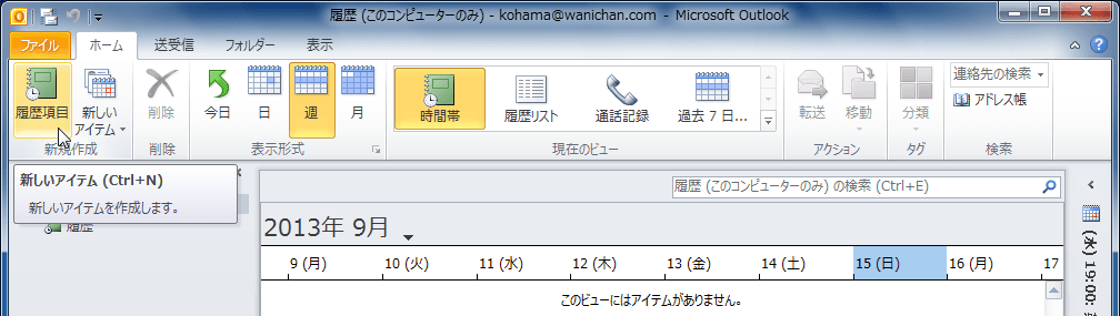 - [履歴]フォルダーを開き、[ホーム]タブの[新規作成]グループの[履歴項目]をクリックします。