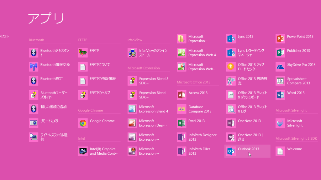 - アプリ一覧から[Outlook 2013]をクリックします。