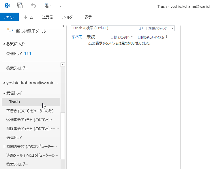ちなみに、「ごみ箱」はOutlook 2013側で「Trash」として検索できますが、「削除済みアイテム」フォルダーとして認識できないようです。