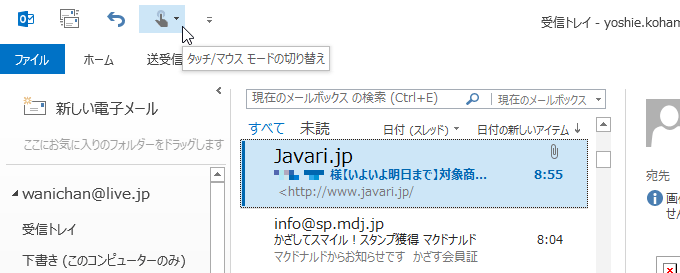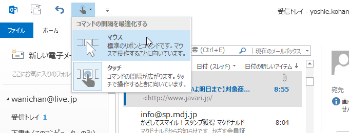 Outlook 2013から、タッチモードとマウスモードの2つのモードが用意されるようになりました。タッチスクリーン端末であれば、タッチモードにすることによって、コマンドの間隔が広くなりタッチ操作がしやすくなります。
