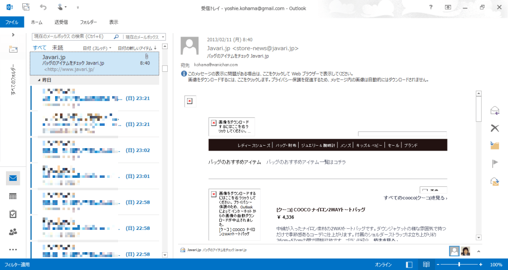 Outlook 2013で閲覧表示モードに切り替えることで、フォルダーウィンドウが最小化され、アイテムが表示される幅が広くなります。ステータスバー右側の[閲覧]をクリック(タップ)することで簡単に切り替えられます。