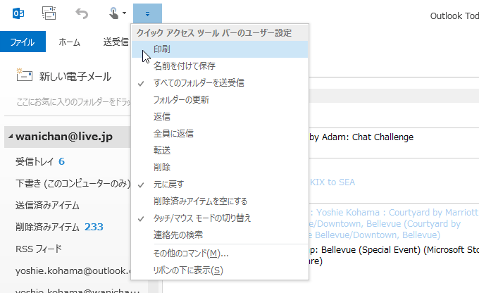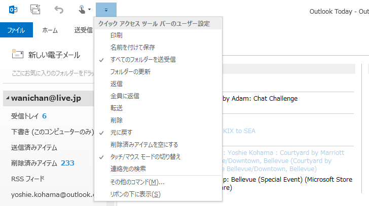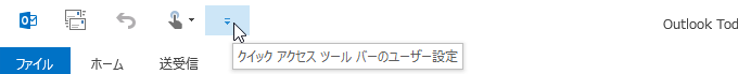 Outlook 2013初期設定では、[すべてのフォルダーを送受信][元に戻す][タッチ/マウス モードの切り替え]の3つのボタンが表示されています。この他に、よく使われるコマンドを簡単に追加することができます。[クイックアクセスツールバーのユーザー設定]をクリックして、追加したいコマンドを選択します。