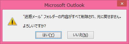 迷惑メールフォルダーを空にしたり、削除済みアイテムフォルダーを空にしようとすると、以下の確認メッセージが表示されます。