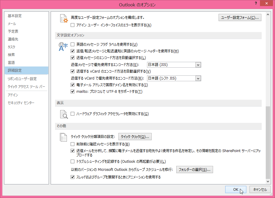 Outlookのオプションの適用と操作