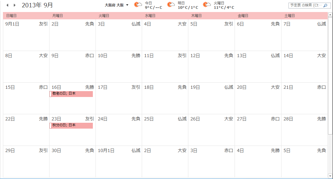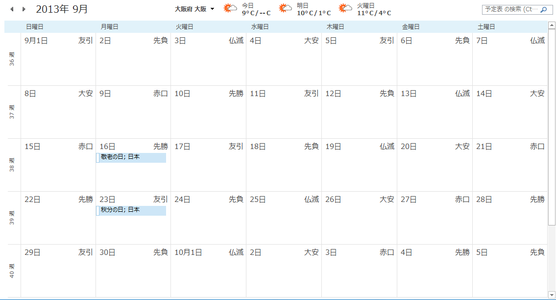 ちなみに、[月のビューとカレンダーナビゲータに週番号を表示する]にチェック入れることによって、以下の図のように週番号を表示することも可能です。