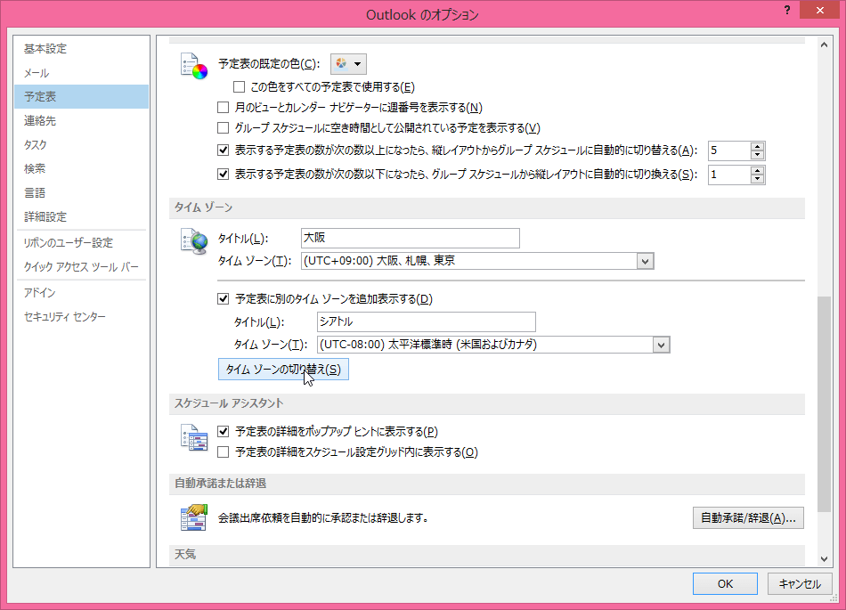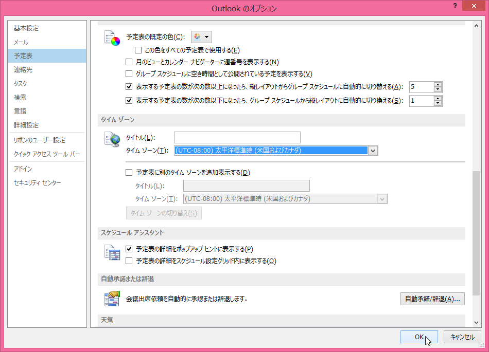 Outlook 2013の予定表の既定のタイムゾーンは日本になりますが、海外にPCを持って行ったとき、その現地のタイムゾーンを設定することができます。Outlookのオプションの[予定表]タブを開き、タイムゾーンを設定します。