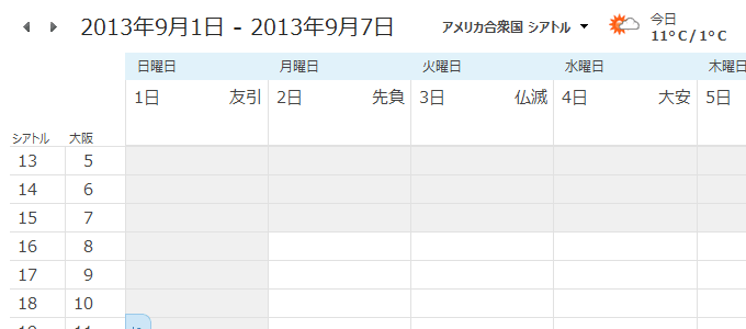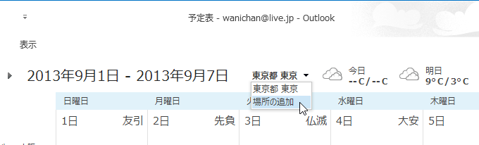Outlook 2013から予定表に天気予報を表示することができるようになりました。Outlookのオプションの[予定表]タブを開き、[天気]オプションの[予定表に天気予報を表示する]にチェックを入れて、華氏または摂氏を選択します。そのあと、場所を追加したり削除したりすることが可能です。