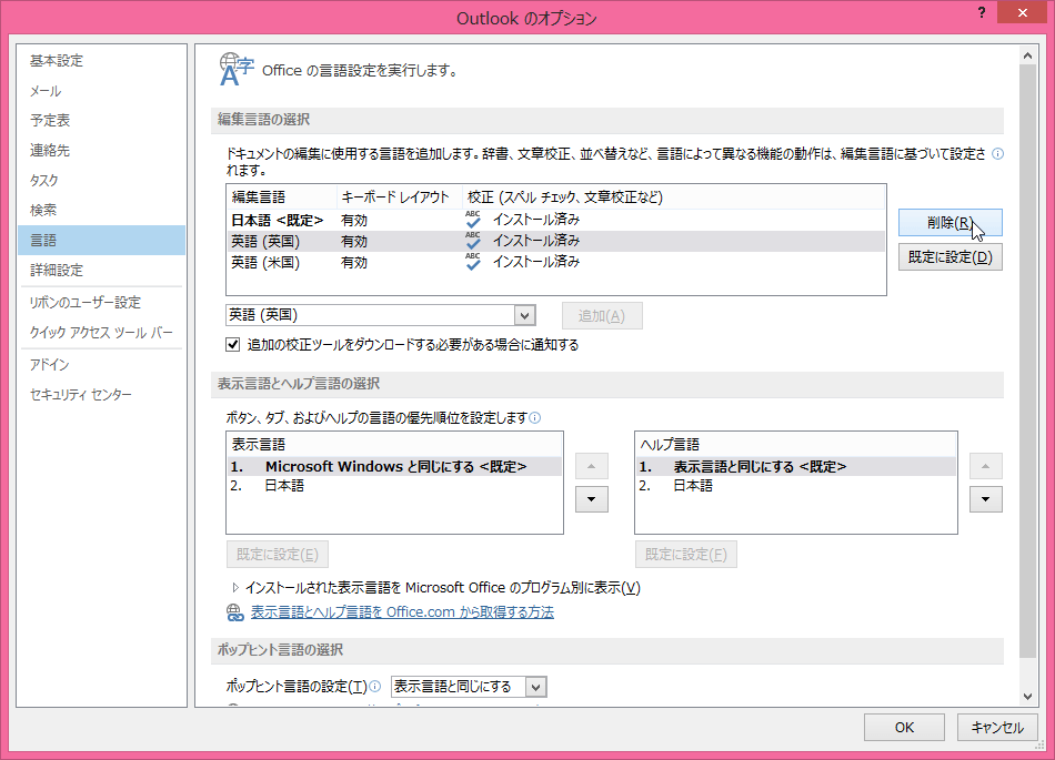既定では、日本語と英語(米国)が編集言語として設定され、日本語が既定に設定されています。この記事では、Outlook 2013で他の編集言語を追加・削除したり、表示言語とヘルプ言語の優先順位を設定する方法について説明します。