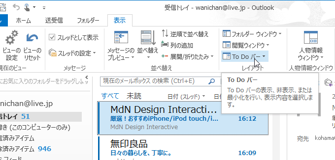 - [表示]タブを開き、[レイアウト]グループの[To Do バー]をクリックします。