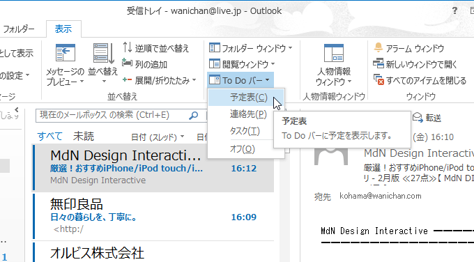 「予定表」「連絡先」「タスク」をTo Do バーに表示した場合