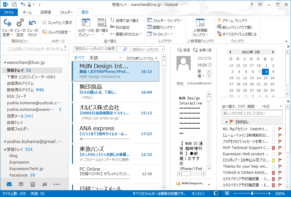 Outlook 2010まで既定で予定表やタスクが画面の右側に配置されていましたが、Outlook 2013から既定でオフ(非表示)になりました。To Do バーを表示するには、[表示]タブを開き、[レイアウト]グループの[To Do バー]をクリックして、一覧から表示したいものにチェック付けます。