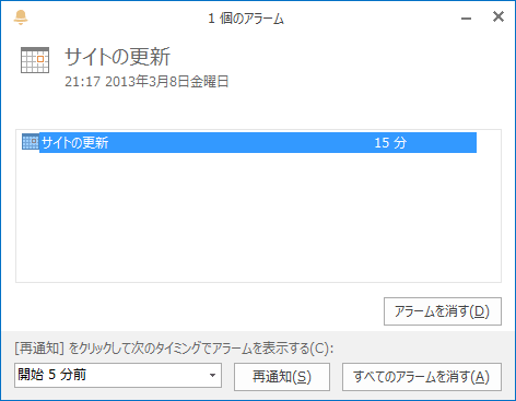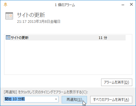 - アラームウィンドウが表示されたら、再通知のタイミングを一覧から選択します。