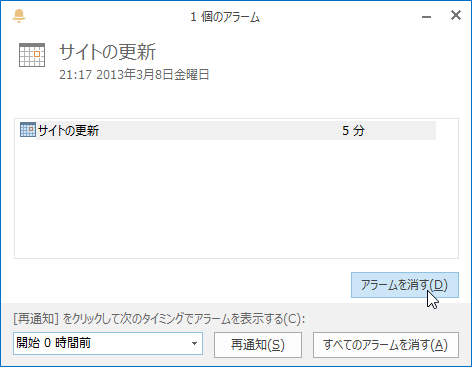 アラームウィンドウが表示されたら、消したいアラームを選択して[アラームを消す]ボタンをクリックします。