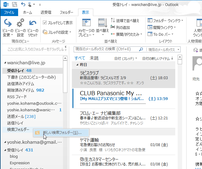 - 検索フォルダーをクリックして、[新しい検索フォルダー]をクリックします。