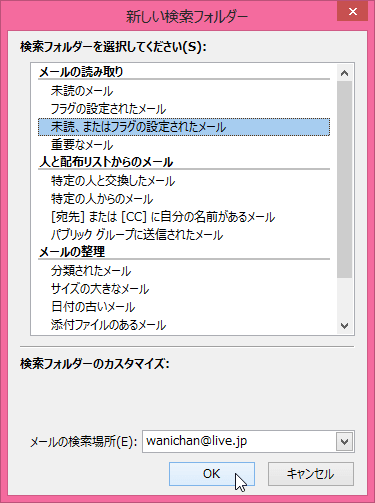 - 検索フォルダーの対象を確認して[OK]ボタンをクリックします。