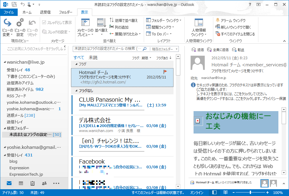 - 検索フォルダーが作成され、未読、またはフラグの設定されたメールの一覧が表示されました。