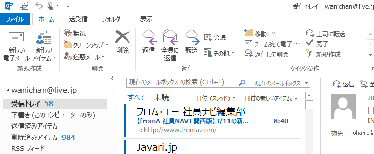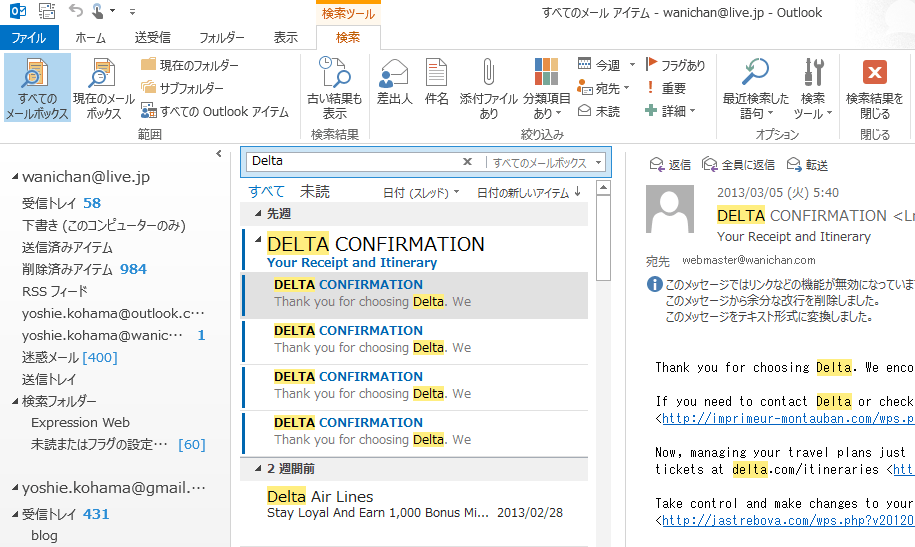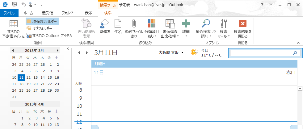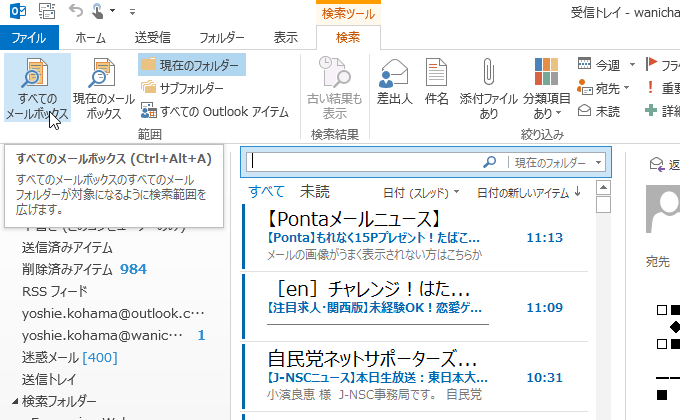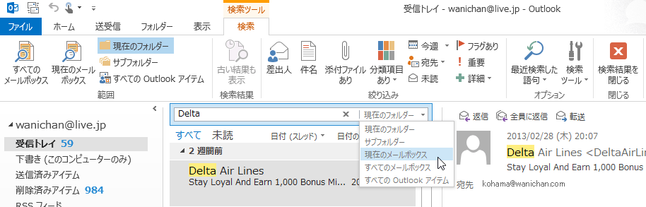 メールでの検索ボックスの右側には検索対象範囲を簡単に変更することができます。リボンコマンドで操作するか、あるいは検索ボックス右側で検索対象範囲を変更するかのいずれかで行えます。