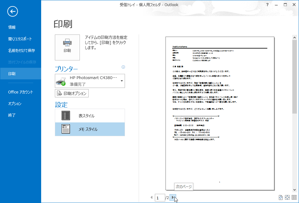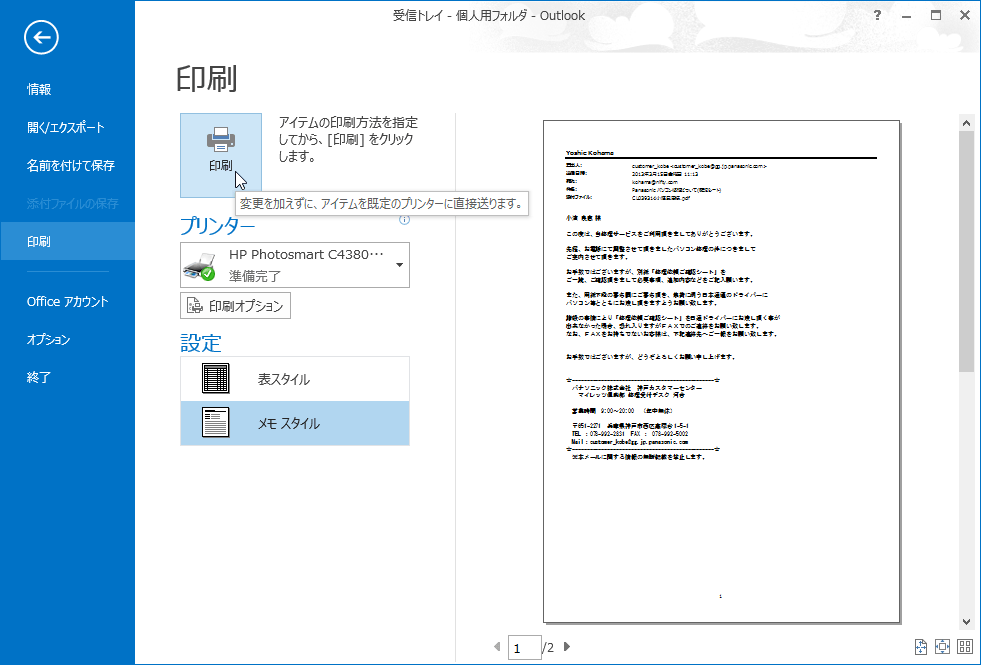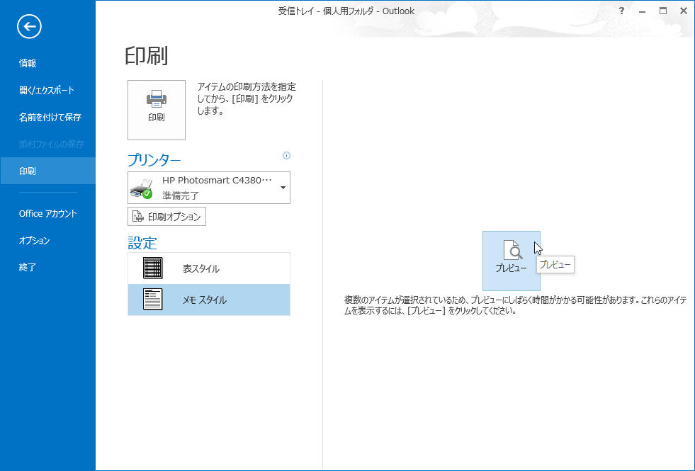 なお、メールの内容を印刷する場合は[メモスタイル]、メールアイテムの一覧の場合は[表スタイル]を選択します。ここでは[メモスタイル]のままでOKです。