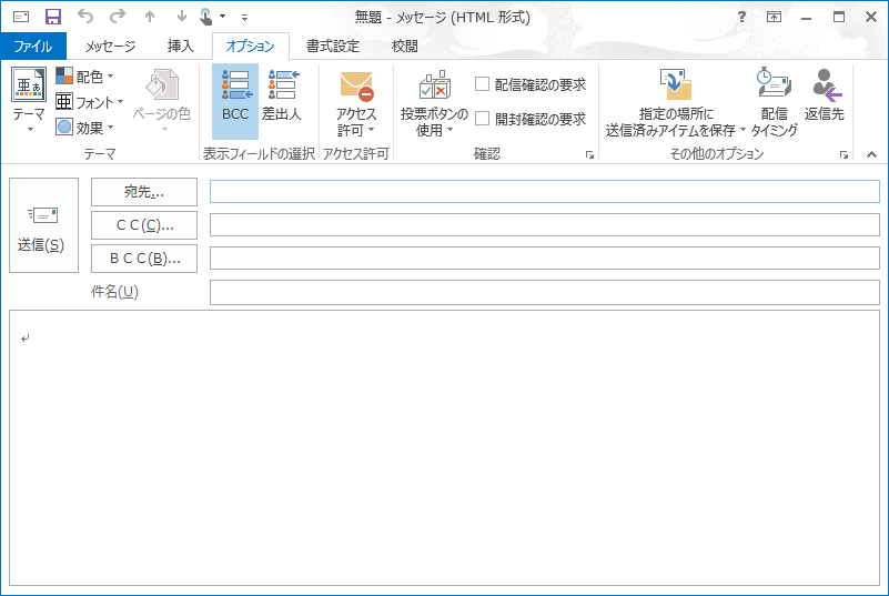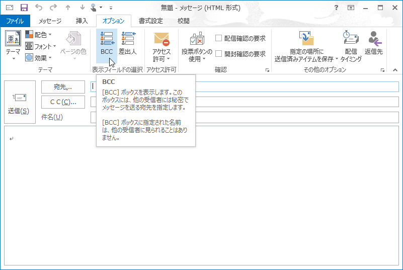 なお、BCCフィールドは既定では非表示になっています。BCCは「Blind Carbon Copy」の略で、他の受信者には秘密でメッセージを送る宛先を指定します。