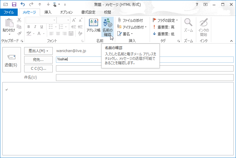 - [宛先]ボックスに名前を入力して[メッセージ]タブの[名前の確認]をクリックします。