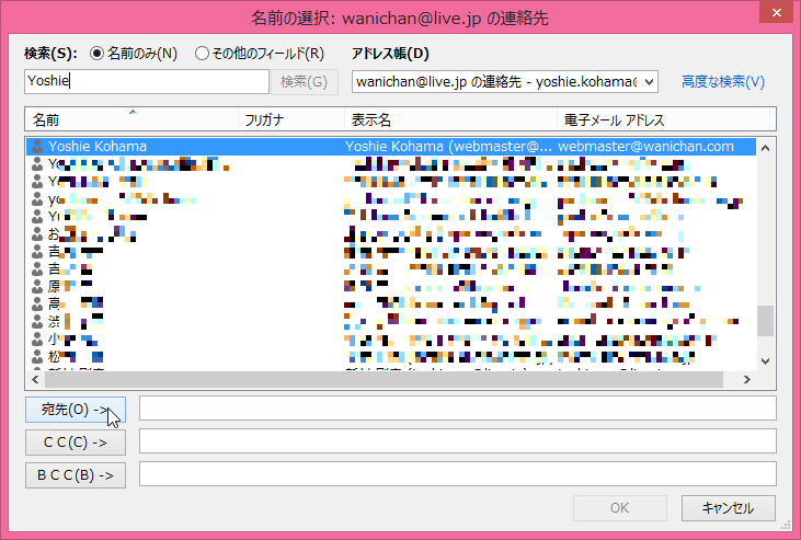 - 宛先を選択して、宛先、CC、BCCのうちいずれかのボタンを押します。ここでは、宛先ボタンをクリックします。