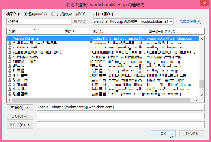 - 宛先として送信先が指定できたら[OK]ボタンをクリックします。