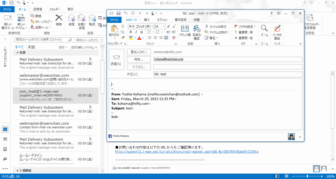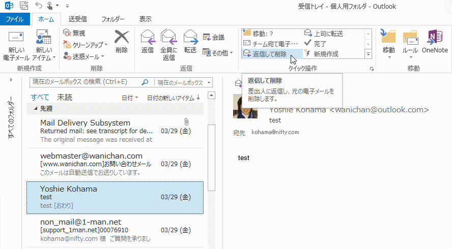 - 差出人に対する返信メッセージが新規作成され、元のメッセージが削除されました。