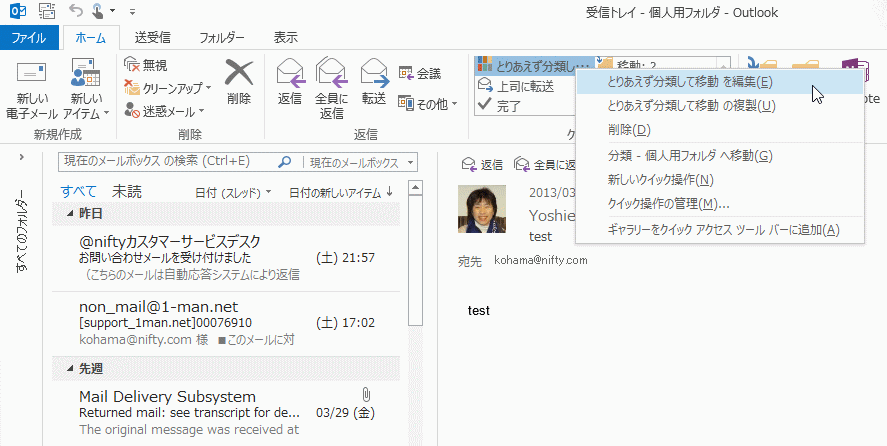 Outlook 2013の既存のクイック操作を編集するには、[ホーム]タブの[クイック操作]グループの中から編集したいコマンドを右クリックしてショートカットメニューより[○○○ の編集]をクリックします。