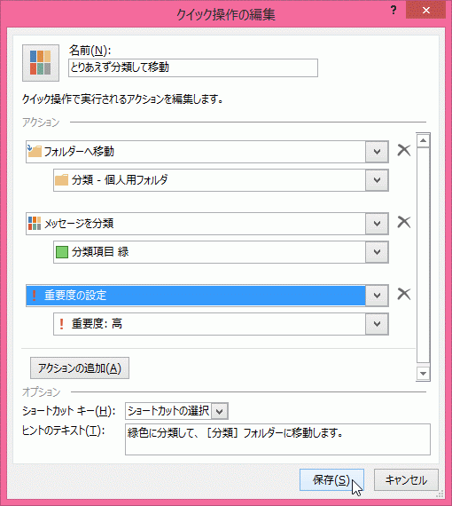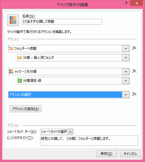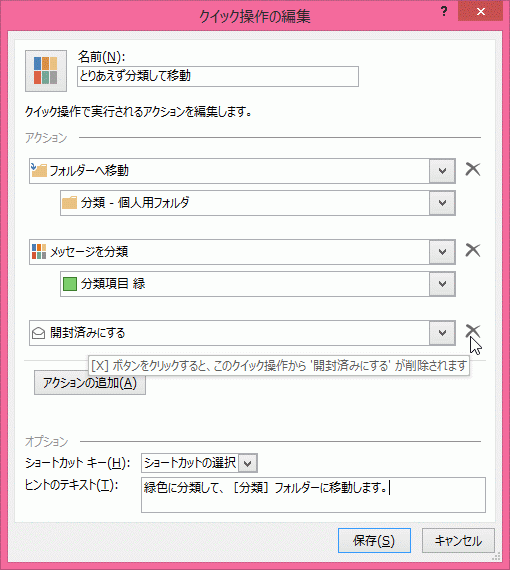[新しいクイック操作]から作成したコマンドを、後でカスタマイズすることもできます。[新しいクイック操作]からの作成は、アクションの追加や削除が行えず、ヒントのテキストも指定できません。
