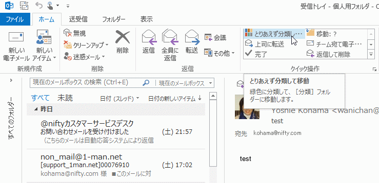 - [ホーム]タブの[クイック操作]グループから不要なコマンドを右クリックします。