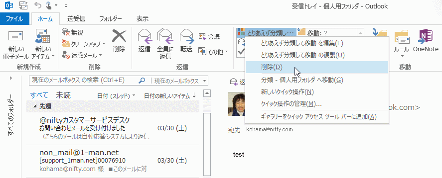 Outlook 2013の不要なクイック操作を削除するには、対象となるコマンドを右クリックして、ショートカットメニューより[削除』をクリックします。