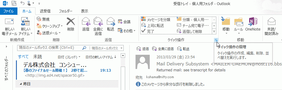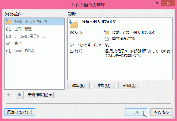 - [クイック操作の管理]ダイアログボックスの[OK]ボタンをクリックします。