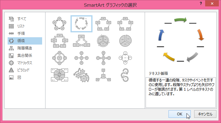 - [SmartArt グラフィックの選択]ダイアログボックスが表示されたら、一覧から選択します。