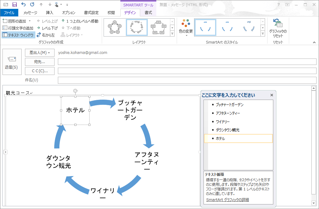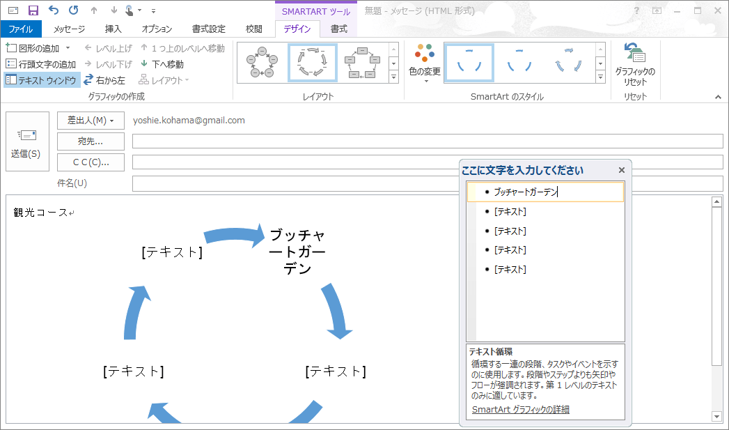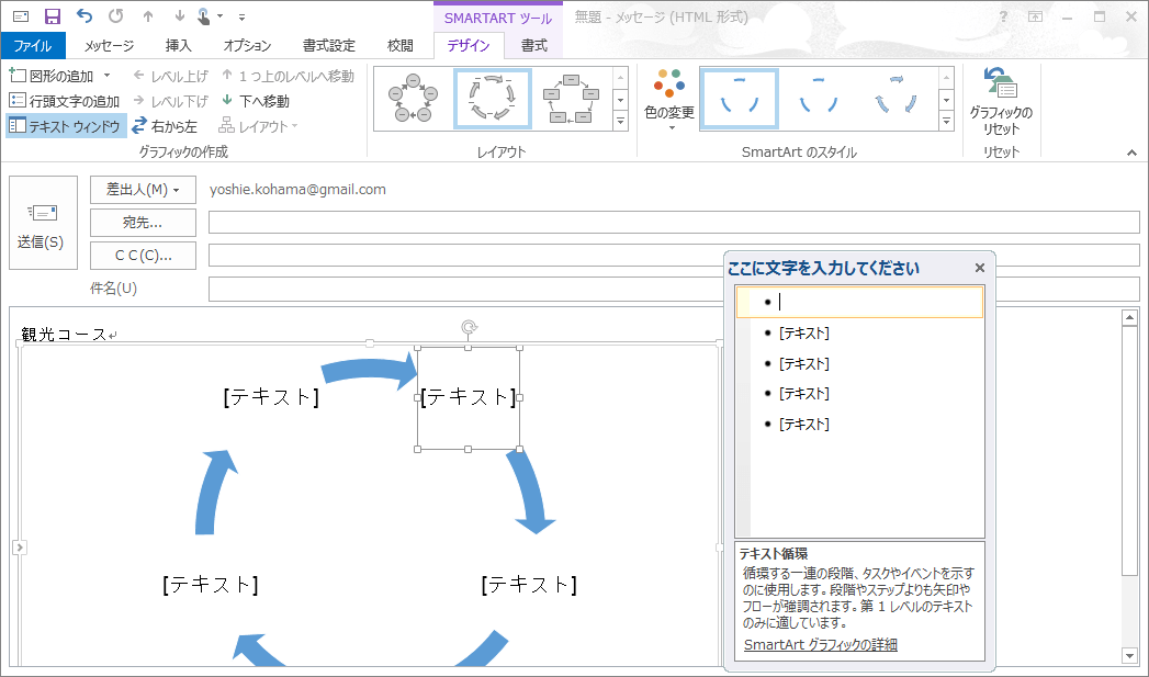 メモ:[テキストウィンドウ]を使用せずに、SmartArtグラフィックの各図形に直接入力することもできます。