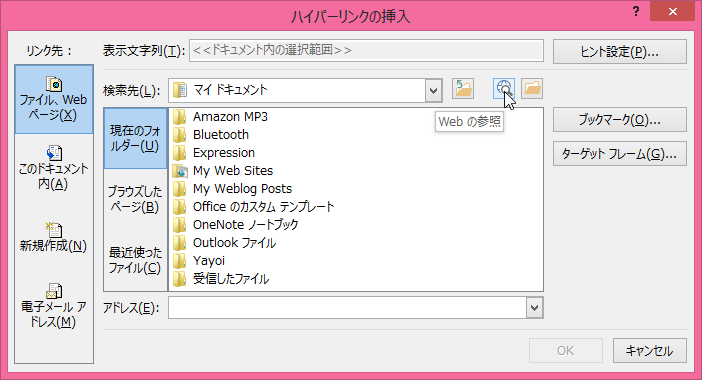 - [ハイパーリンクの挿入]ダイアログボックスの[Webの参照]をクリックします。