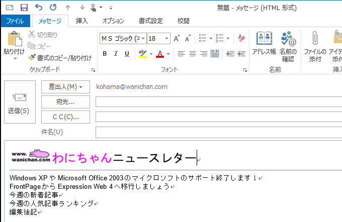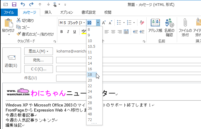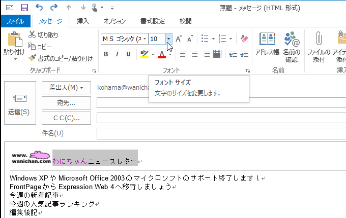文字サイズを変更するには、[メッセージ]タブまたは[書式設定]タブを開き、[フォント]グループの[フォントサイズ]ボックス一覧からサイズを選択します。[フォント]グループの[ダイアログボックス起動ツール]をクリックして設定することも可能です。