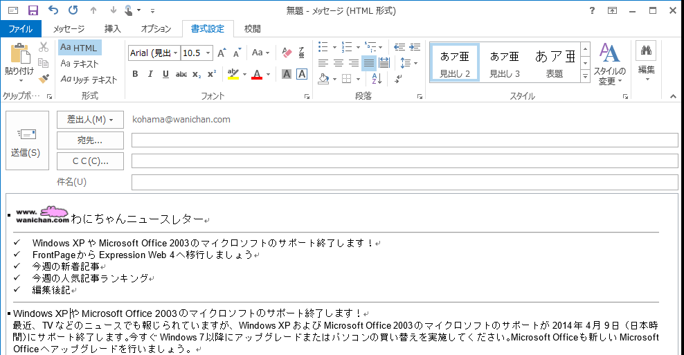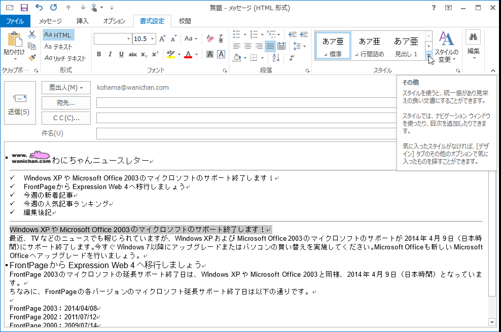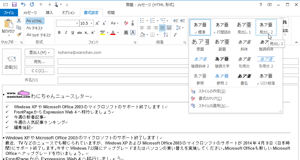 Outlook 2013で洗練された、美しいメールにするには、スタイルを使いこなすことが重要です。ただ文字を大きくするだけではなく、見出しは見出しスタイルとして定義させることで、スタイルの管理がしやすくなり、統一感が生まれます。また、組み込みのスタイルセットや配色を自由に変更することで、思い通りにデザインすることが可能です。